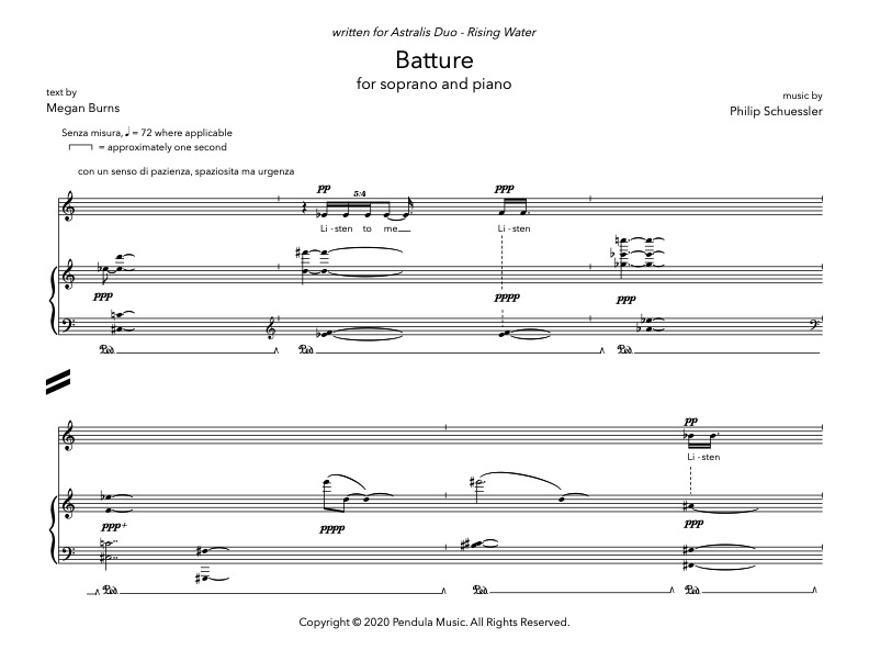 Batture was written for the Astralis Duo, commissioned as part of the Rising Water Project, and is dedicated to Stephanie Aston and Katalin Lukács.