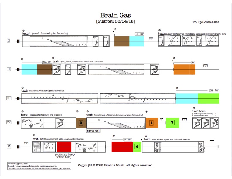 The Brain Gas score-building project is an ongoing series of compositions in which pieces can be constructed using composer-provided tools placed in unique arrangements. Each Brain Gas piece is to be written for a set number of instruments and for a designated performance date (for which the subtitled is named (i.e. Quartet:06/04/18). The pieces can, of course, be performed subsequently after the initial date of premiere.