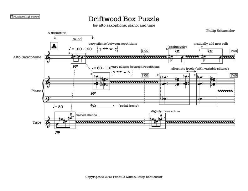 Driftwood Box Puzzle mixes structured improvisatory musical figures with strictly notated sections to create contrasting textures juxtaposed with one another. The resulting form of such interactions may be analogous to a labyrinthine kind of musical game in which the instruments and electronics wind around each other in order to find a “way out.”