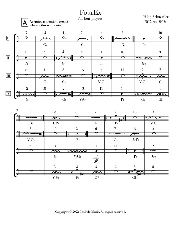 This particular work is an adaptation of another work entitled Five. For these works, there are four types of material: pitched, noise (or “glitch”), a pitch-noise hybrid (or “glitch-pitch”) and silence. Each of these materials is represented in the score by different sets of graphic symbols to be composed, interpreted openly, by the performers.