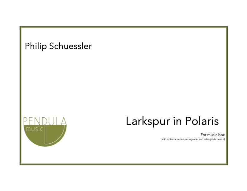 Larkspur in Polaris, written for David Nunn, is for a manual-crank music box that sounds a perfect fourth higher than written. The work can be performed as a solo music box work, or it can be performed in canon (up to four voices) with pre- recorded versions of itself (live performer with digital playback), or with multiple music boxes (two-to-four players). The work can also be performed in retrograde. Retrograde performances can also be solo or in canon (up to four voices).