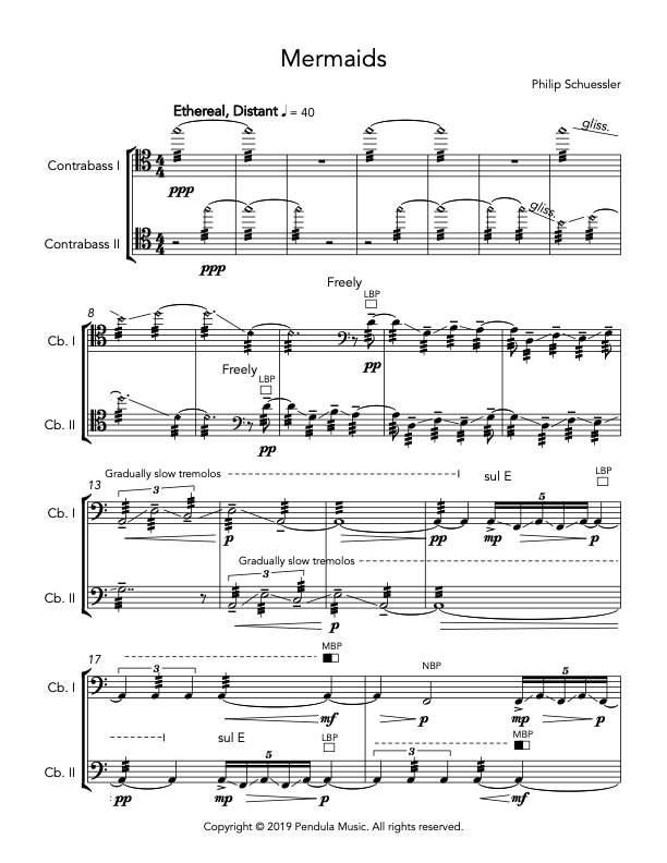 The contrabass has an incredibly wide spectrum of sounds that can be produced from total noise to pure tone. For this work, I wished to explore that spectrum to find those sounds of “inbetween-ness” – those sounds of constant transition, change, and instability. The dialogue between the two basses is always in motion, always seeking common ground and balance, yet the conversation yields a murky residue in its wake. There is an elegance and beauty to these two icons, standing side by side as a pair; there is also something sinister, something bubbling under the surface. This work was written for Keri Pertuit and Maddi Wanner.