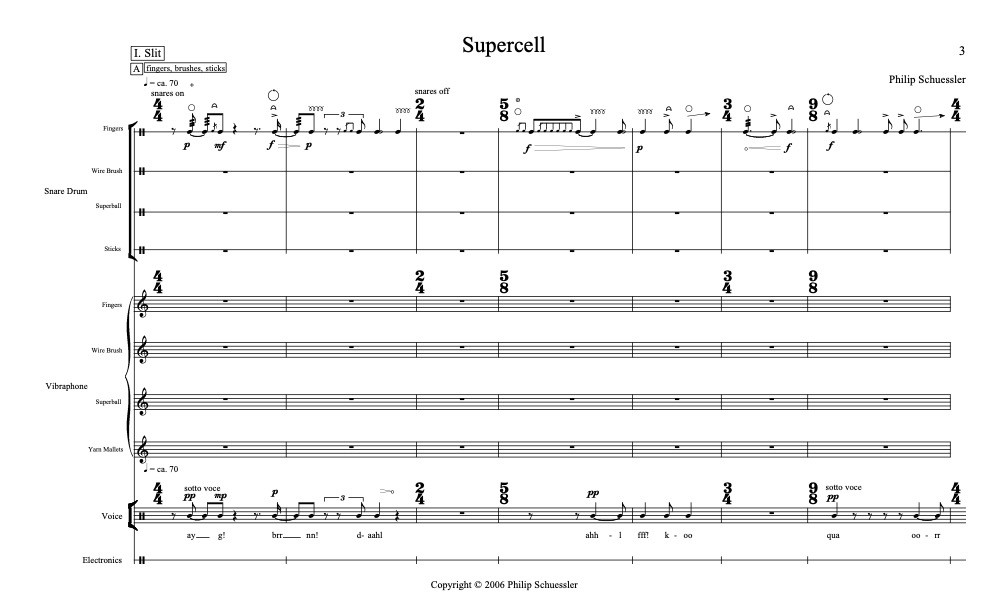 Written for percussionist Michael McCurdy, Supercell involves the construction and decoupling of multilayered complexes. The instrumentation and modes of production are seen as elements of an organic whole that are separated as a study in the mechanics of operation of that whole. The metaphor of the ‘whole’ in this piece is language as neologism. Musical elements parse out components of language. Instruments merge with the voice and electronics to gradually reveal the separate elements as layers of a larger orchestration. The ‘whole’ has greater significance than the separate parts: any possible interpretation of embedded meaning in this language. Electronic processes, using Max/MSP, include filtering, frequency shifting, ring modulation, granular synthesis, live amplitude triggering, and live pitch triggering.