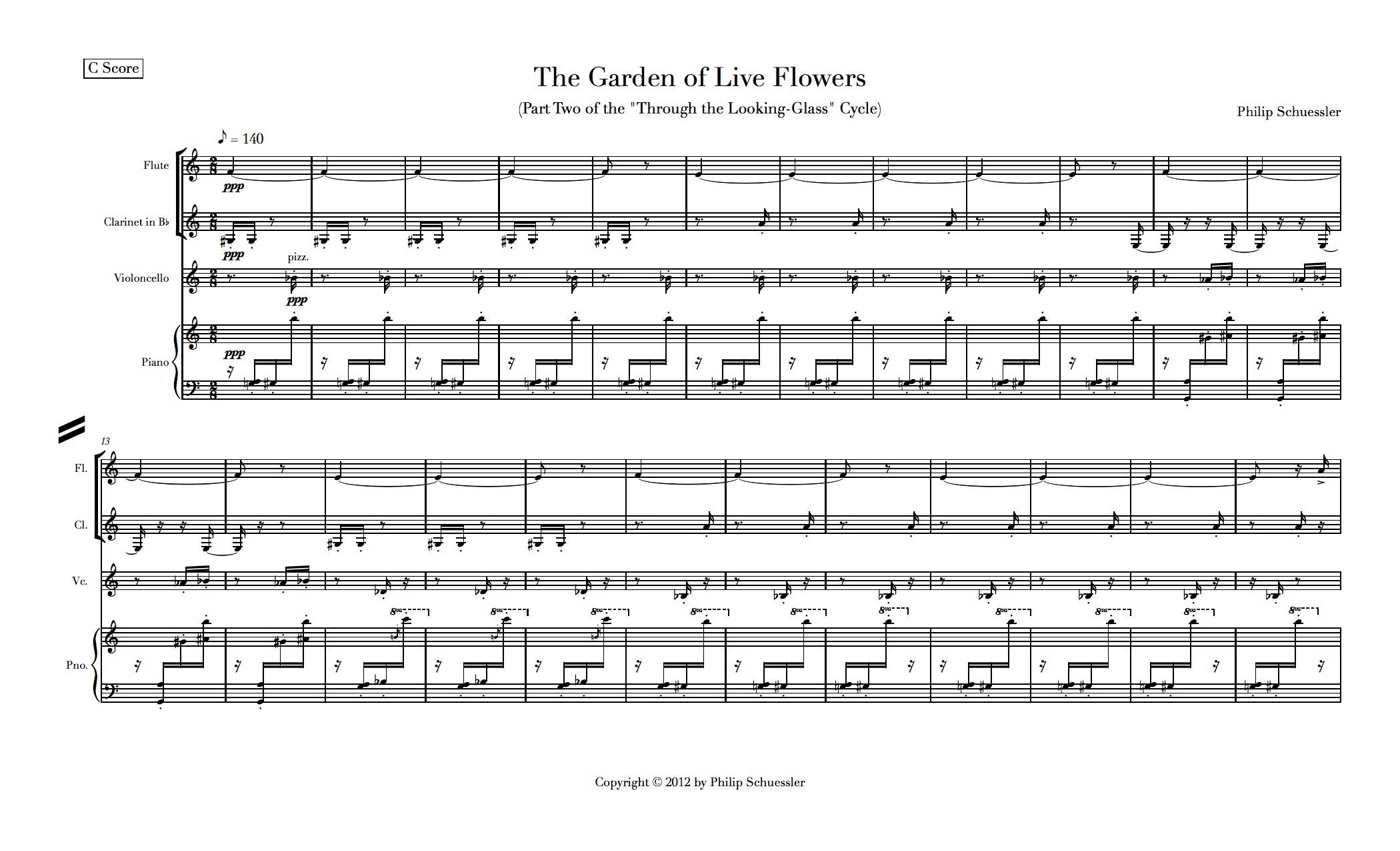 This work is the second part of a cycle of chamber works loosely based on the sequential chapters of Lewis Carroll’s Through The Looking-Glass. Here the instruments have their own personalities that weave together in a dialogue that emulates the speaking flowers of chapter two of Carroll’s masterpiece. The personalities are constrained within the dynamic, timbral, and rhythmic ranges guiding the entire work, yet they each maintain their own characteristics, whether shimmering, wistful, or menacing.