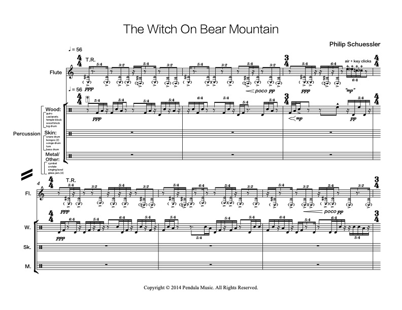 The Witch On Bear Mountain was commissioned by the New York-based Iktus Duo (Chris Graham – percussion, Hristina Blagoeve – flute) . The title of the work is inspired by imaginary folklore and mythology without any rooted, specific reference. The work explores a broad trajectory of rapid, noise-based techniques, unaligned in the instruments, moving towards pitch-based, rhythmic unisons.